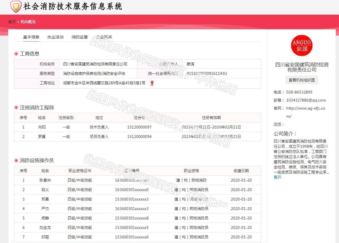 四川省安國建筑消防檢測有限責任公司,成立于1998年,經(jīng)四川省公安消防總隊批準,工商部門注冊的獨立法人單位。